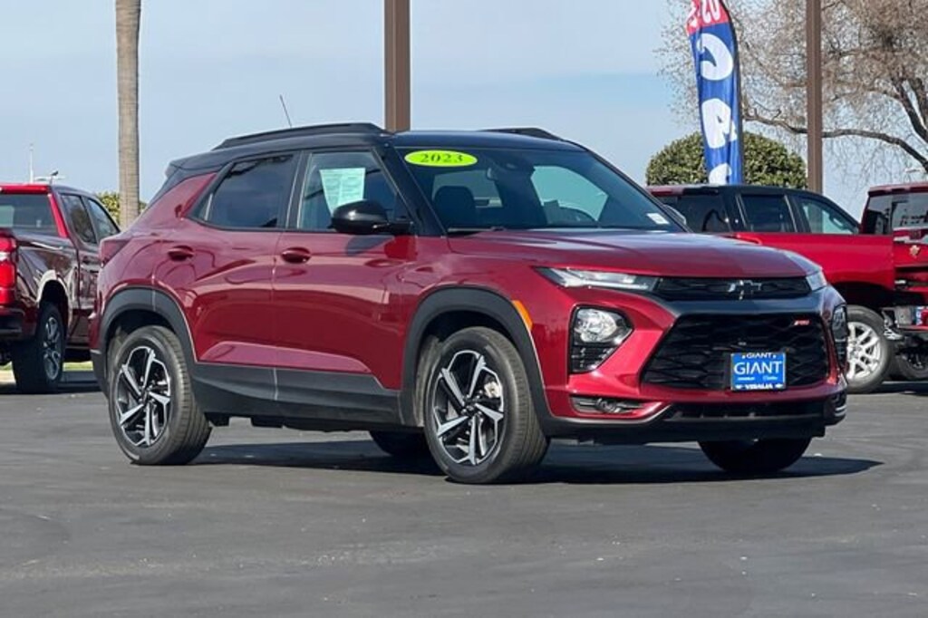 Giant Chevrolet is proud to offer this 2023 Chevrolet TrailBlazer RS Crimson Metallic. Clean CARFAX. 1.3L Ecotec Turbo DOHC SIDI w/VVT 60 pt Inspection, Low Miles, Extra Clean!, One Owner, Non Smoker!, Recent Oil Change, Well equipped with 1 Type-A & 1 Type-C USB Charging-Only Ports, Well equipped with 120-Volt Power Outlet, Well equipped with 2-Way Adjustable Front Head Restraints, Well equipped with 2-Way Power Driver Lumbar Seat Adjuster, Well equipped with 4-Way Manual Front Passenger Seat Adjuster, Well equipped with 4-Wheel Disc Brakes, Well equipped with 4.2 Diagonal Multi-Color Driver Info Center, Well equipped with 5.45 Axle Ratio, Well equipped with 6 Speakers, Well equipped with 6-Speaker Audio System Feature, Well equipped with 7 Diagonal Color Touchscreen, Well equipped with 8-Way Power Driver Seat Adjuster, Well equipped with 8 Diagonal Color Touchscreen Display, Well equipped with ABS brakes, Well equipped with Adaptive Cruise Control, Well equipped with Air Conditioning, Well equipped with Alloy wheels, Well equipped with AM/FM radio: SiriusXM, Well equipped with Auto High-beam Headlights, Well equipped with Bose Premium 7-Speaker Audio System Feature, Well equipped with Brake assist, Well equipped with Bumpers: body-color, Well equipped with Cabin Humidity Sensor, Well equipped with Cargo Mat, Well equipped with Cloth w/Leatherette Seat Trim, Well equipped with Compass, Well equipped with Convenience Package, Well equipped with Delay-off headlights, Well equipped with Driver & Front Passenger Illuminated Vanity Mirrors, Well equipped with Driver Confidence Package, Well equipped with Driver door bin, Well equipped with Driver vanity mirror, Well equipped with Dual front impact airbags, Well equipped with Dual front side impact airbags, Well equipped with Dual-Pane Panoramic Power Sunroof, Well equipped with Electronic Stability Control, Well equipped with Emergency communication system: OnStar and Chevrolet connected services capable, Well equipped with Exterior Parking Camera Rear, Well equipped with Flat-Folding Front Passenger Seatback, Well equipped with Front & Rear All-Weather Floor Liners (LPO), Well equipped with Front anti-roll bar, Well equipped with Front Bucket Seats, Well equipped with Front Center Armrest, Well equipped with Front fog lights, Well equipped with Front License Plate Bracket, Well equipped with Front reading lights, Well equipped with Front wheel independent suspension, Well equipped with Fully automatic headlights, Well equipped with Hands-Free Power Programmable Liftgate, Well equipped with HD Radio, Well equipped with HD Rear Vision Camera, Well equipped with Heated door mirrors, Well equipped with Heated Driver & Front Passenger Seats, Well equipped with Heated front seats, Well equipped with Heated Steering Wheel, Well equipped with Heated steering wheel, Well equipped with Illuminated entry, Well equipped with Inside Rear-View Auto-Dimming Mirror, Well equipped with Knee airbag, Well equipped with Lane Change Alert w/Side Blind Zone Alert, Well equipped with Leather Shift Knob, Well equipped with Leather steering wheel, Well equipped with LED Headlamps, Well equipped with Low tire pressure warning, Well equipped with Memory Card Receptacle, Well equipped with Mosaic Black Metallic Two-Tone Roof, Well equipped with Not Equipped w/Rear Park Assist (060), Well equipped with Occupant sensing airbag, Well equipped with Overhead airbag, Well equipped with Overhead console, Well equipped with Panic alarm, Well equipped with Passenger door bin, Well equipped with Passenger vanity mirror, Well equipped with Power door mirrors, Well equipped with Power driver seat, Well equipped with Power steering, Well equipped with Power windows, Well equipped with Preferred Equipment Group 1RS, Well equipped with Radio data system, Well equipped with Radio: Chevrolet Infotainment 3 Plus System, Well equipped with Radio: Chevrolet Infotainment 3 Syste
